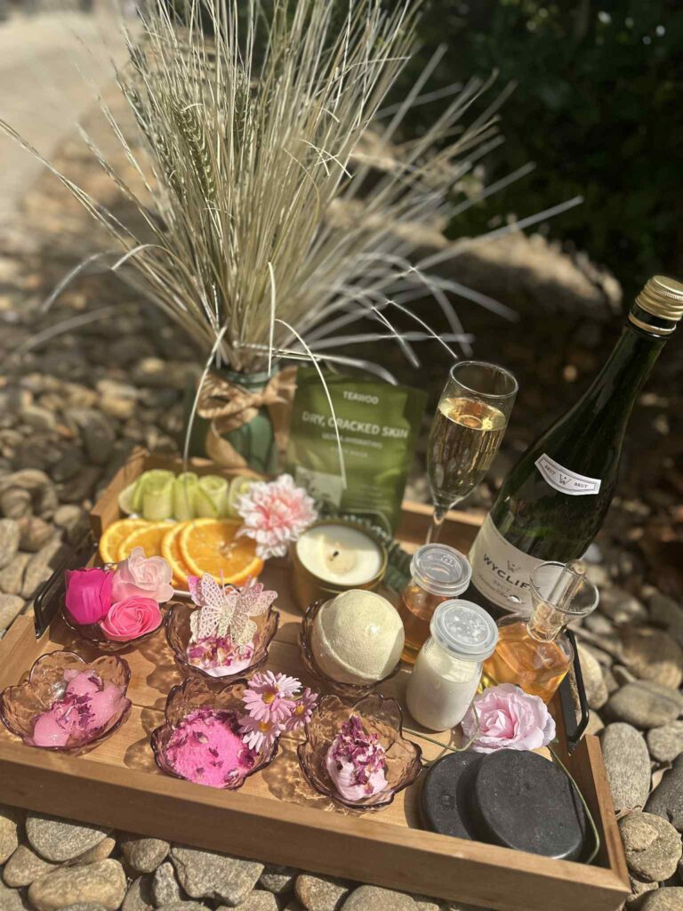 Indulge in a champagne soak with rose petals, followed by a milk and honey citrus scrub that nourishes skin and fights aging by neutralizing free radicals. Enjoy sea salt exfoliation, a collagen mask, and collagen cream, finishing with deeply moisturizing collagen socks, massage oil candle and spa steamer.